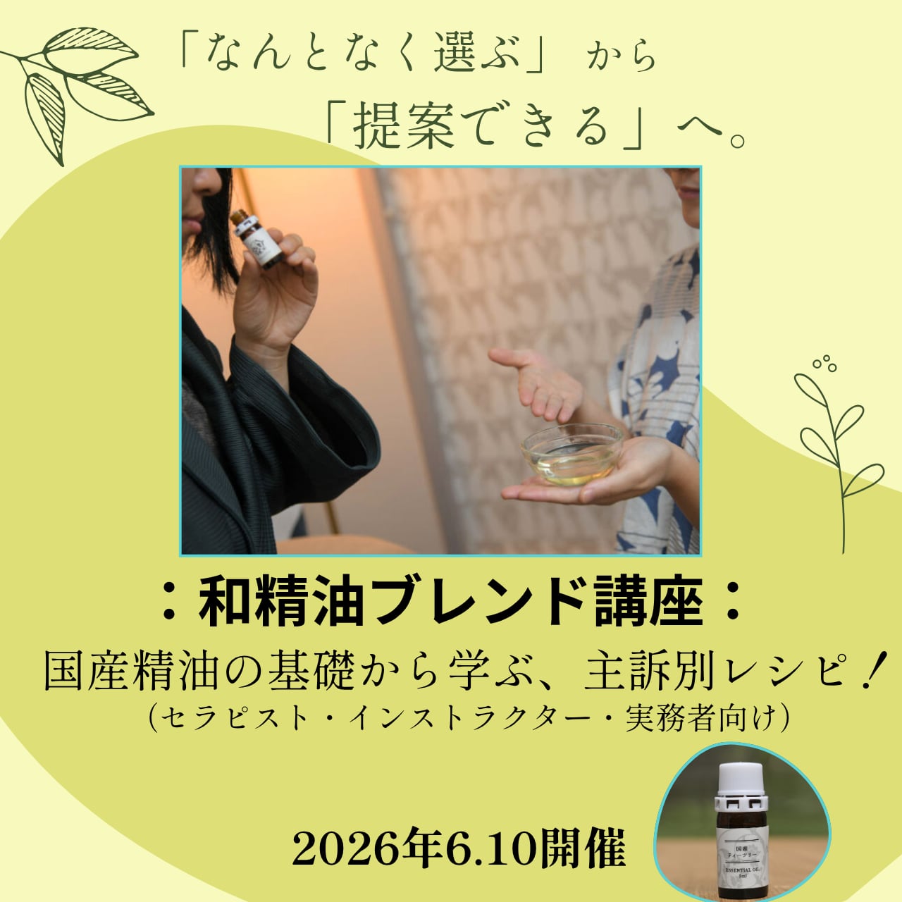 【6/10開催】和精油ブレンド講座|国産精油の基礎から学ぶ主訴別レシピ(セラピスト・インストラクター・実務者向け) 申込はこちら 締め切り5/30!