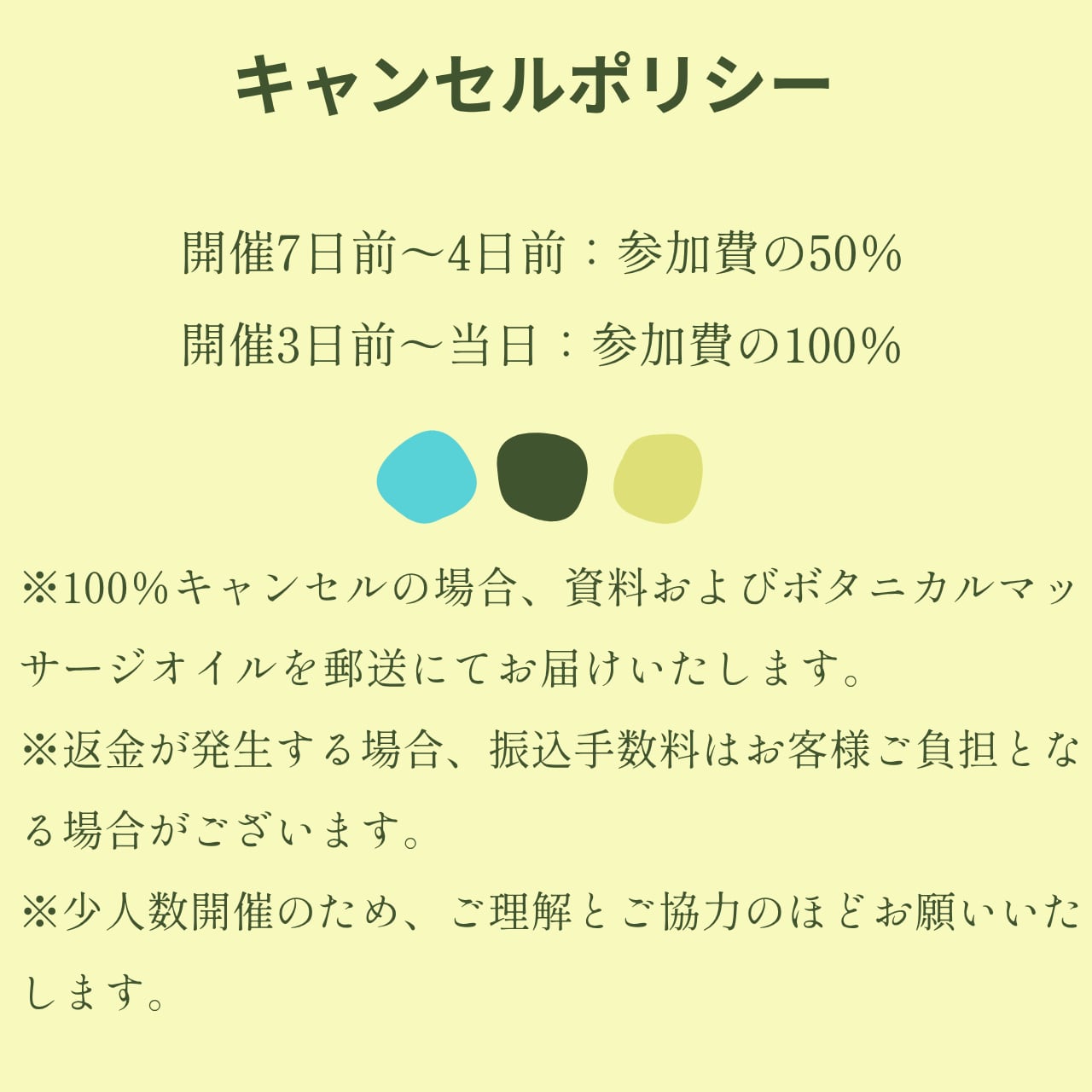 ※100%キャンセルの場合、資料およびボタニカルマッサージオイルを郵送にてお届けいたします。