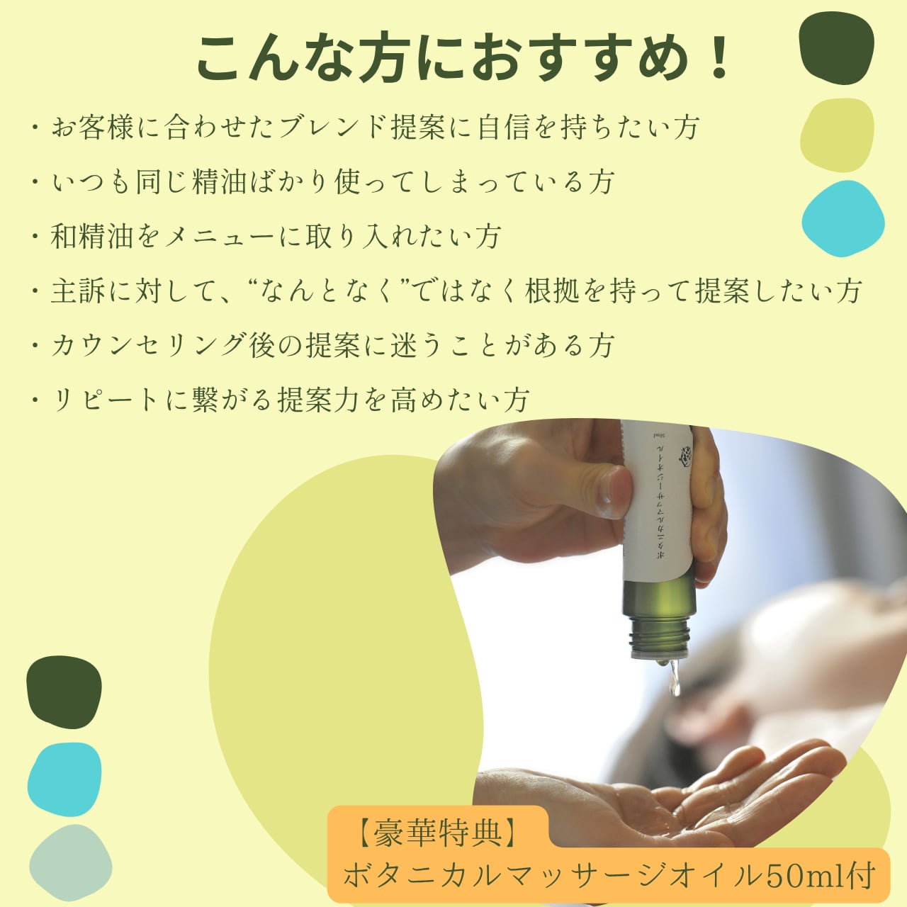 サロンでよくある主訴に対応した、和精油のブレンドレシピを学ぶ実践講座です。